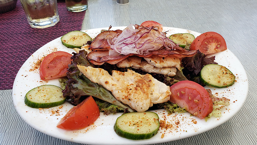 Prices were what I expected for an amusement park/tourist area. Ordered the chicken and bacon salad. It was tasty, but a bit too oily. Overall, a nice healthy salad helps to digest all the chocolate & junk food.