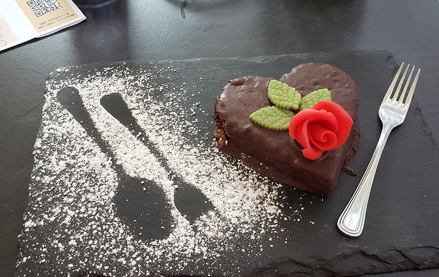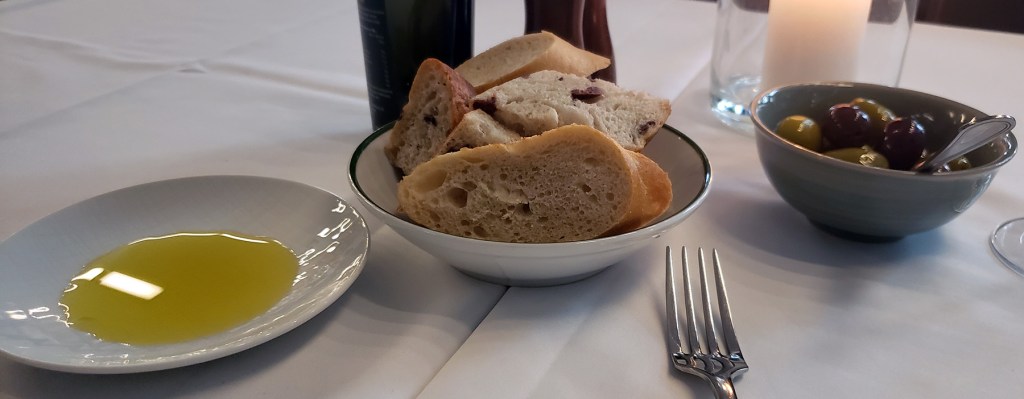 The trio of fish pâté was good, offering different flavors and textures. The tomato soup was tomato soup – nothing special there. Be careful not to feel up on the bread and olives, because the bread is good. I wanted dessert, but my stomach was full.