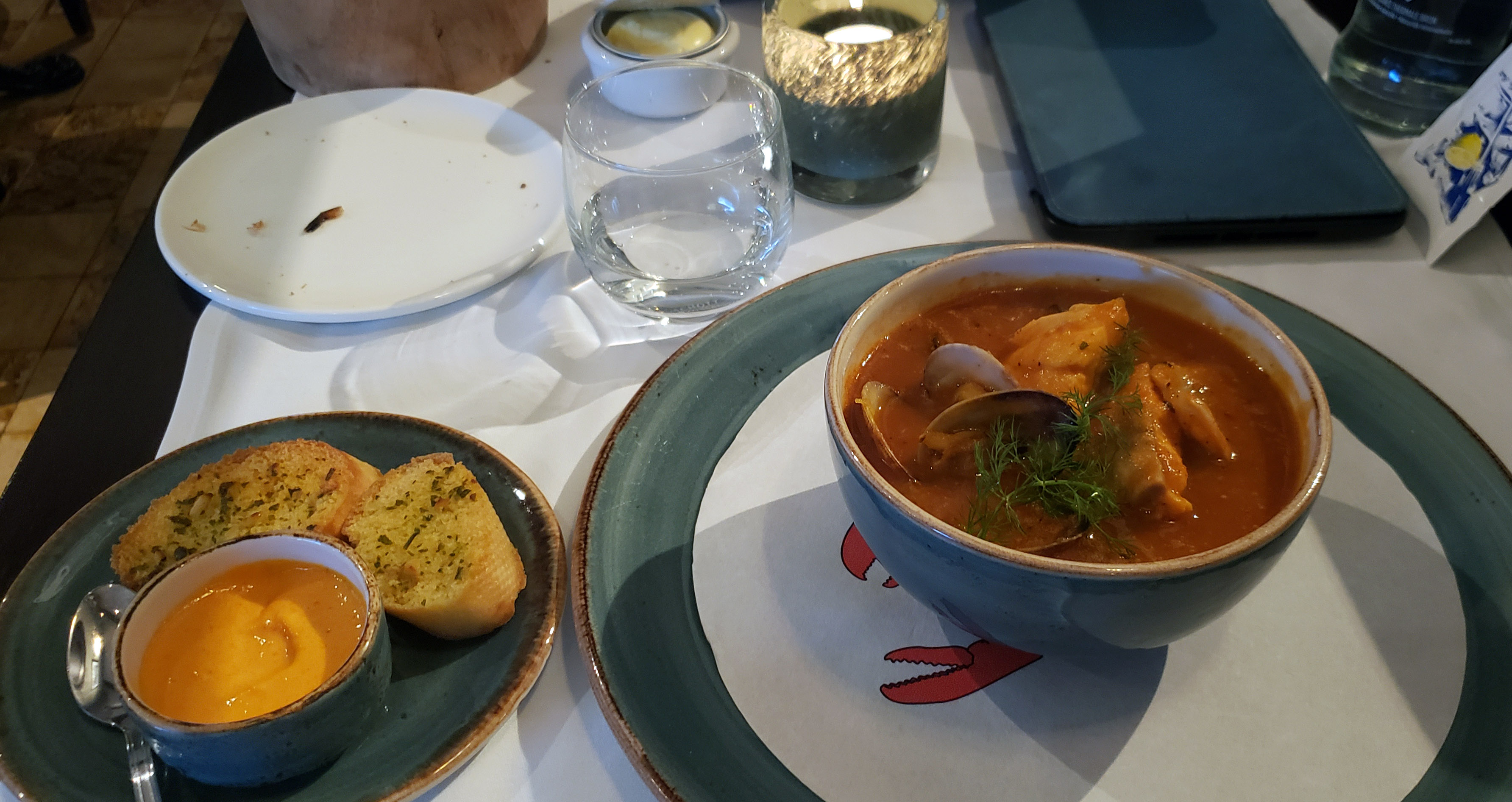 Prices geared toward the expensive side of the budget scale, but I always budget for two fine dining meals during my travels, so I was good. Nevertheless, I avoided the ‘market price’ lobster choices and ordered the Seafood Soup and Dover Sol Fish Special.